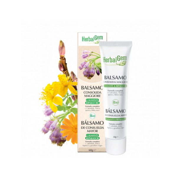 la acción sinérgica de la consuelda asociada árnica, al hipérico y a la caléndula, el bálsamo calma y refuerza el poder
